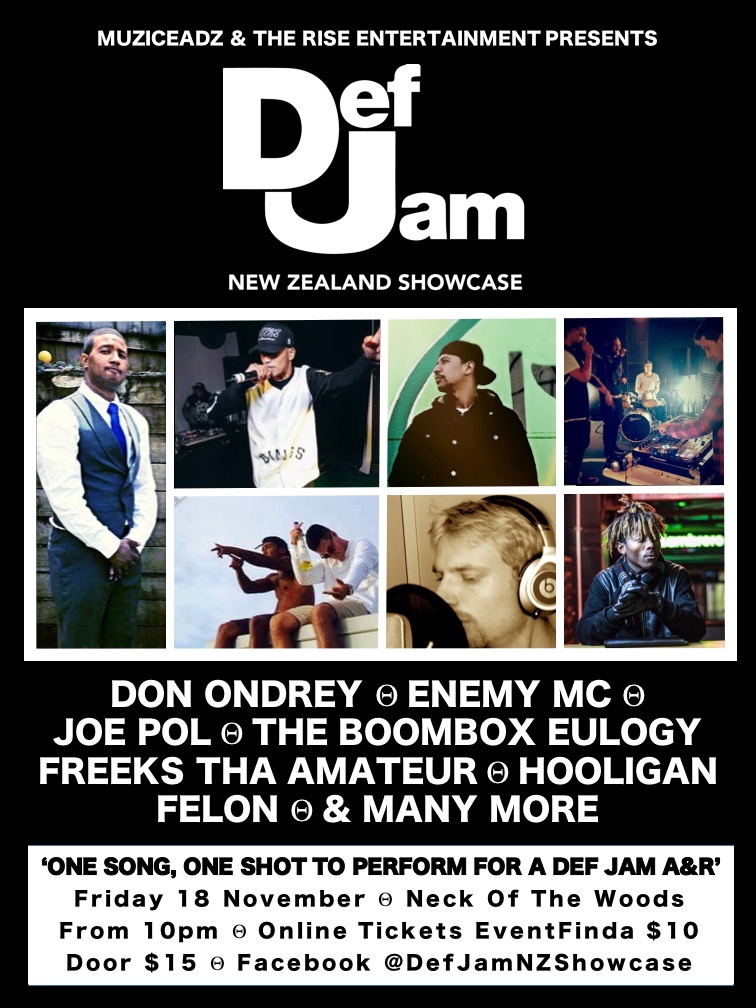 Def Jam A&R Michael "Big Mike" Neely from the USA is coming to New Zealand to hear 16 local acts/artists perform in a Def Jam NZ Showcase. This is the Auckland heat for the 18+ age group, to select the talent that will go on to the final showcase on 10 December 2016.