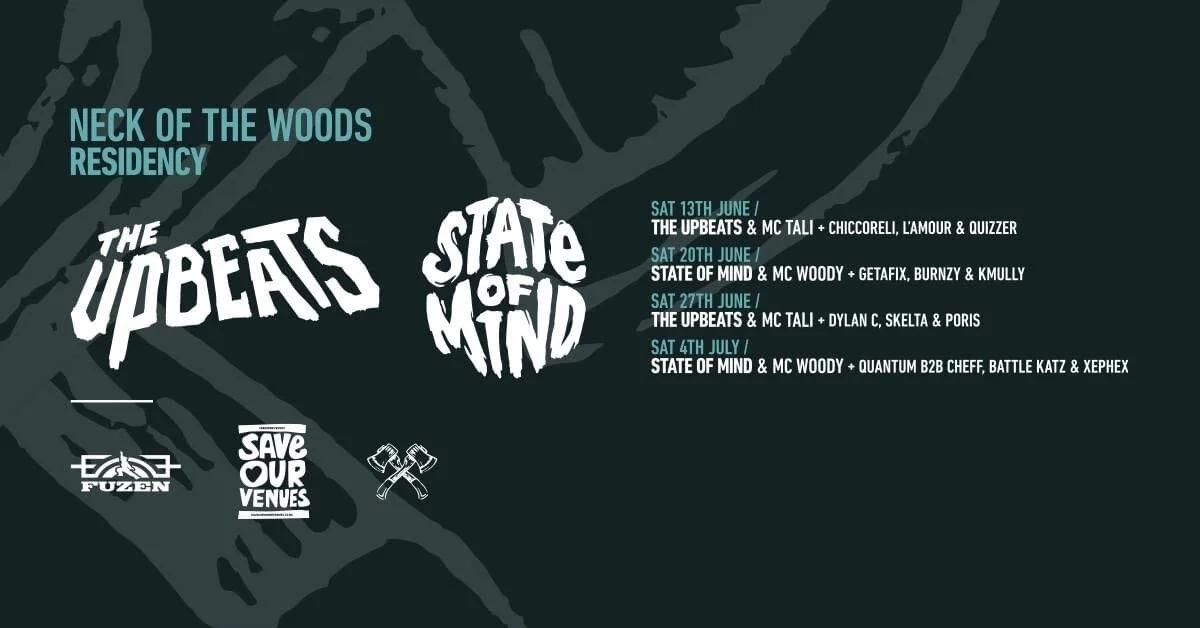 We are going home! Neck of the Woods is reopening and we are going to warm it back up the best way we could think of... announcing the NOTW Residency! New Zealand’s kings of Drum and Bass - The Upbeats and State of Mind are taking over NOTW for the next month and they have handpicked a selection of the best local talent for support duties. ALL tickets on sale 8am, 9 June! **JUNE 13 THE UPBEATS + MC TALI Chiccoreli + L'Amour + Quizzer * Tickets - bit.ly/NOTWWEEK1 **JUNE 20 STATE OF MIND + MC WOODY Getafix + Burnzy + Kmully * Tickets - bit.ly/NOTWWEEK2 **JUNE 27 THE UPBEATS + MC TALI Dylan C + Skelta + Poris * Tickets - bit.ly/NOTWWEEK3 **JULY 4 STATE OF MIND + MC WOODY Quantum b2b Cheff + Battle Katz + Xephex * Tickets - bit.ly/NOTWWEEK4 ALL EVENTS ARE R18